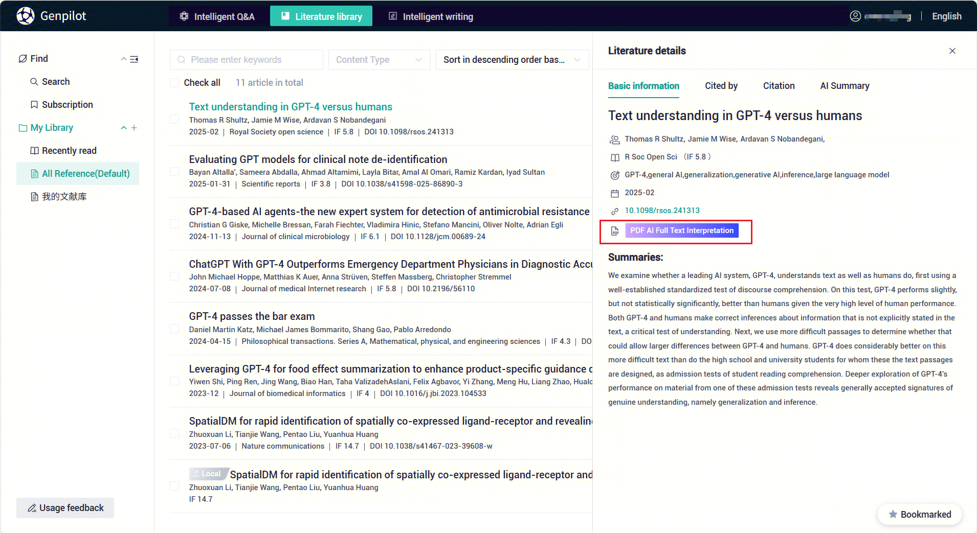 Click on “PDF AI Full Text Interpretation” to perform a full-text interpretation and intelligent Q&A for a single literature.