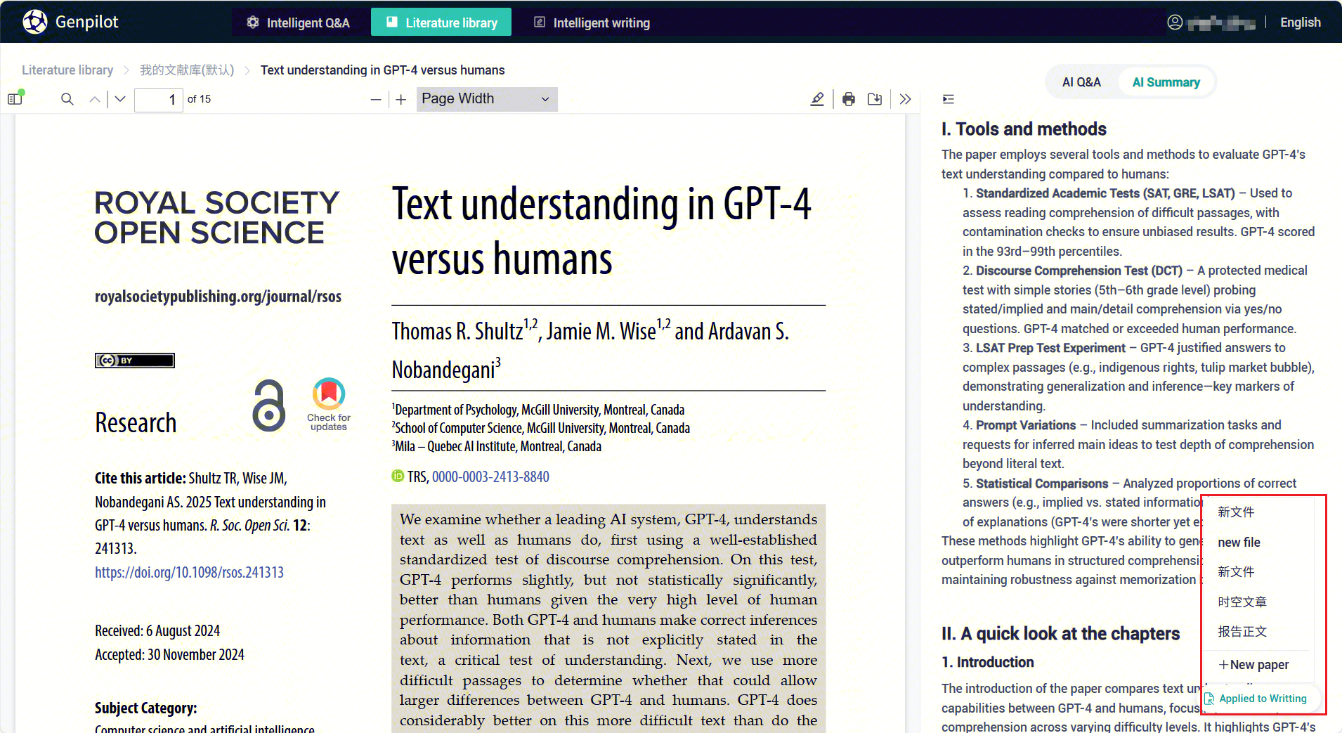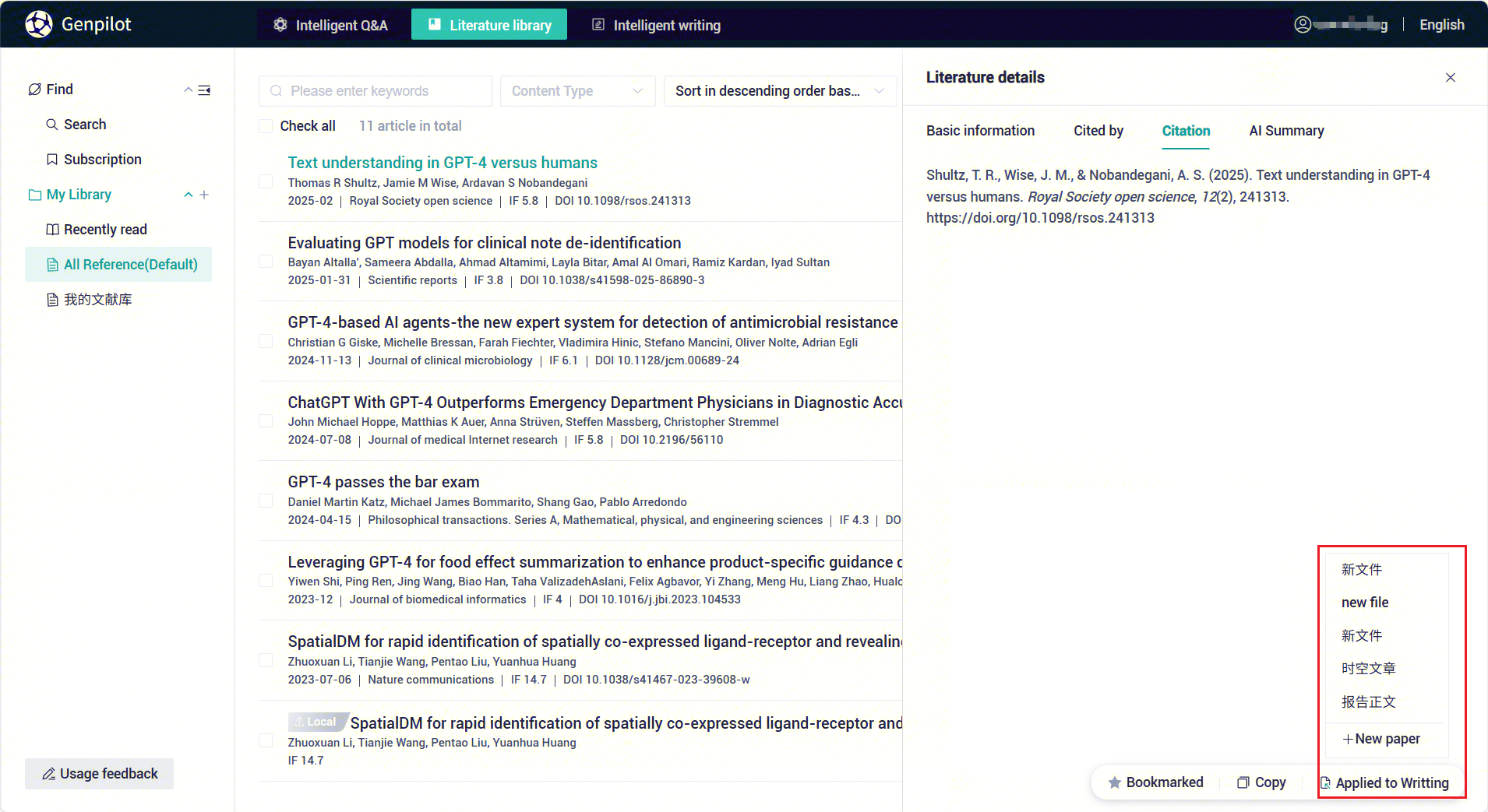 AI Q&A: Engage in intelligent Q&A exchanges about the content of the literature, quickly obtaining the information you need. The answers can be applied to your writing with a single click, inserted at the end of the corresponding article.