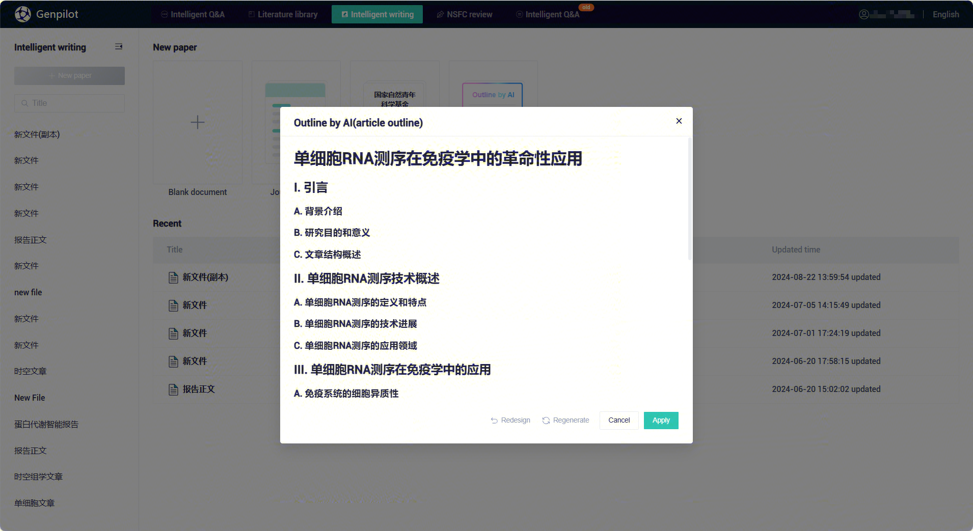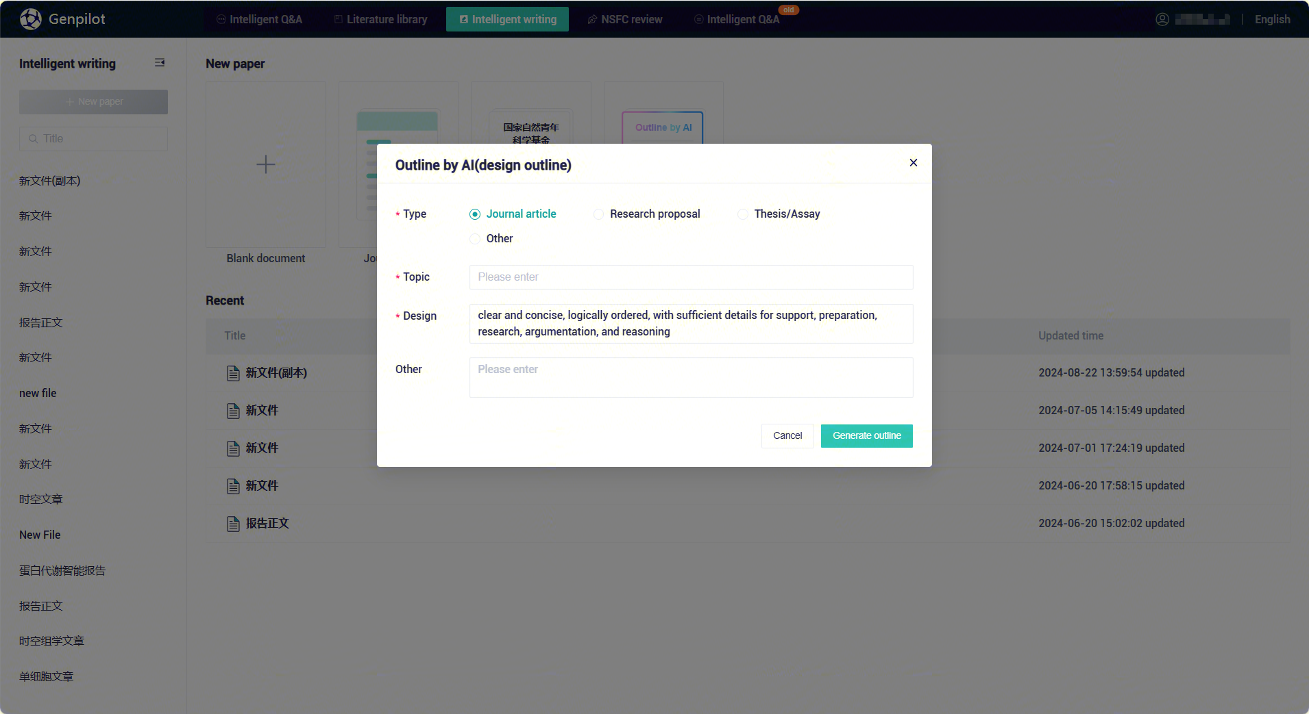 When creating a new paper, you must choose a template. Besides the blank template, Genpilot also provides two scientific research article templates: