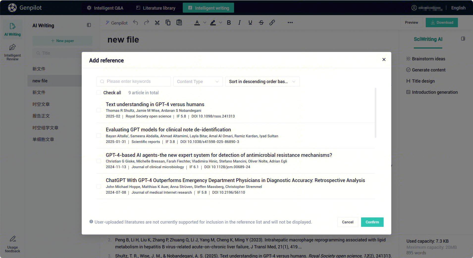 Manually add: Users can manually input literature information to add it as a reference for the article.
