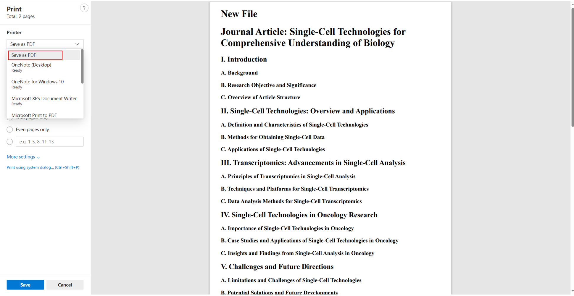 If you choose to download PDF, a print page will pop up. Choose "Save as PDF" as the printer option and click save. This will allow you to save the article as a PDF file locally: