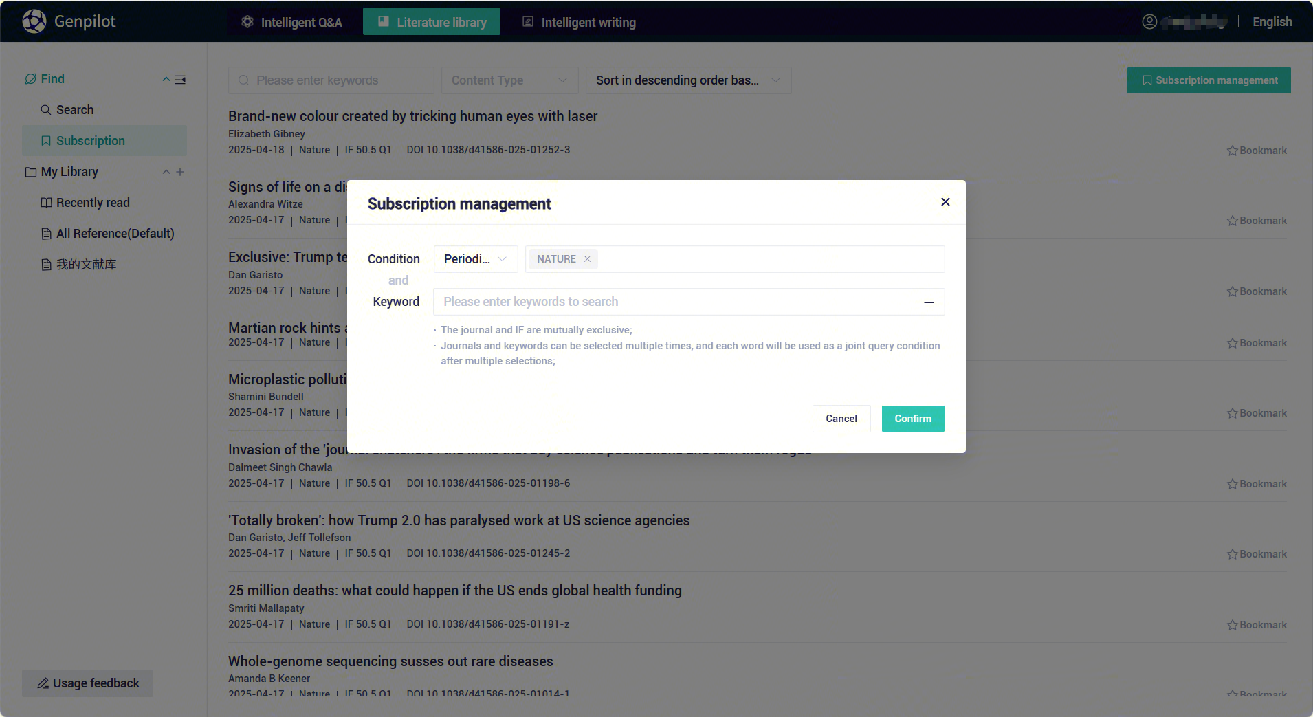 You can create a new literature library by clicking the “+” button next to “My Library.” This allows you to freely upload literature of personal interest for unified management and easy access.