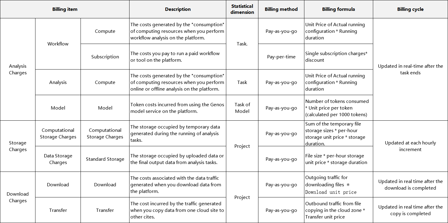 When you run analysis tasks, store data, download files, subscribe to tools, copy files across regions from the cloud, use Genos model services, etc. on the Platform, corresponding fees will be incurred. Currently, the existing or planned business scenarios on the Platform that will generate fees include but are not limited to the following for your reference: