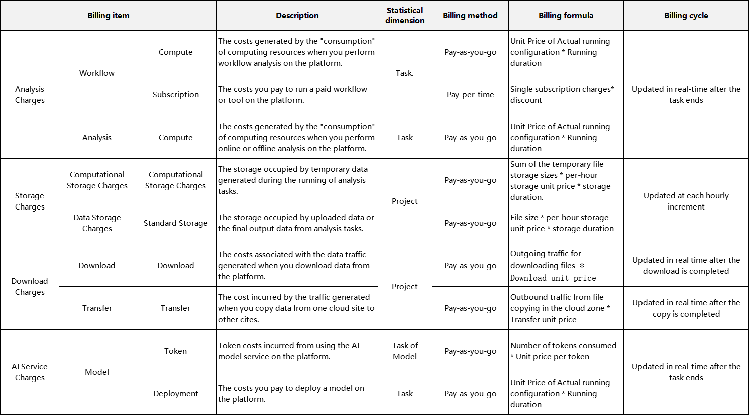 When you run analysis tasks, store data, download files, subscribe to tools, copy files across regions from the cloud, use Genos model services, etc. on the Platform, corresponding fees will be incurred. Currently, the existing or planned business scenarios on the Platform that will generate fees include but are not limited to the following for your reference: