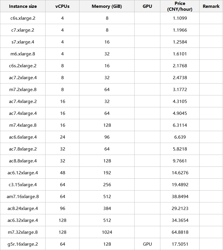 Note: Hourly unit price = Monthly unit price/30 (days)/24 (hours)