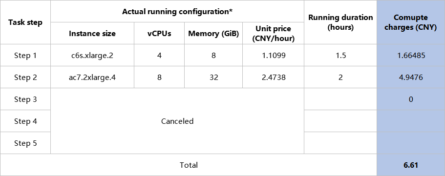 1)Task Success: Suppose you submit a workflow analysis task on the platform, and only compute charges are collected for this task. The task consists of 5 steps. The table below assumes the configurations used and the running durations, and based on these, the task analysis charge is calculated to be 31.18 CNY.