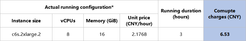 3)Task Cancellation: Suppose when you cancel the task, the compute charges are as shown in the following table. Since the compute charges are less than the subscription charge, the analysis charge is the smaller amount, which is 6.61 CNY. Conversely, if the compute charges are greater than the subscription charge when cancelled, the analysis charge is the subscription charge, which is 70 CNY.