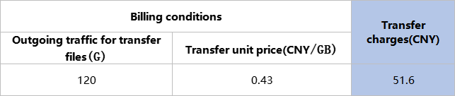 Suppose you download a file from the platform, and the operation results in a total outgoing traffic of 200G, then the download charge would be 86 CNY, as shown in the table below.