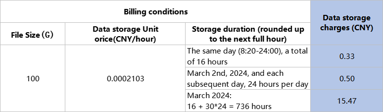 If you uploaded a 100G file to your Project A on the platform at 8:20 AM on March 1st, 2024, and there are no other data files in that project, then the data storage charges for Project A with different storage durations are as detailed in the following table.