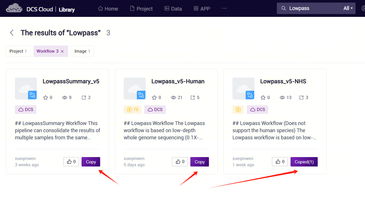 - EnterLowpassin the search box , selectLowpass_v5, click 【Copy】 to go to the next step, and then select again LowpassSummary_v5, click 【Copy】 , skip to step 5 ( Figure 3-5 ) :