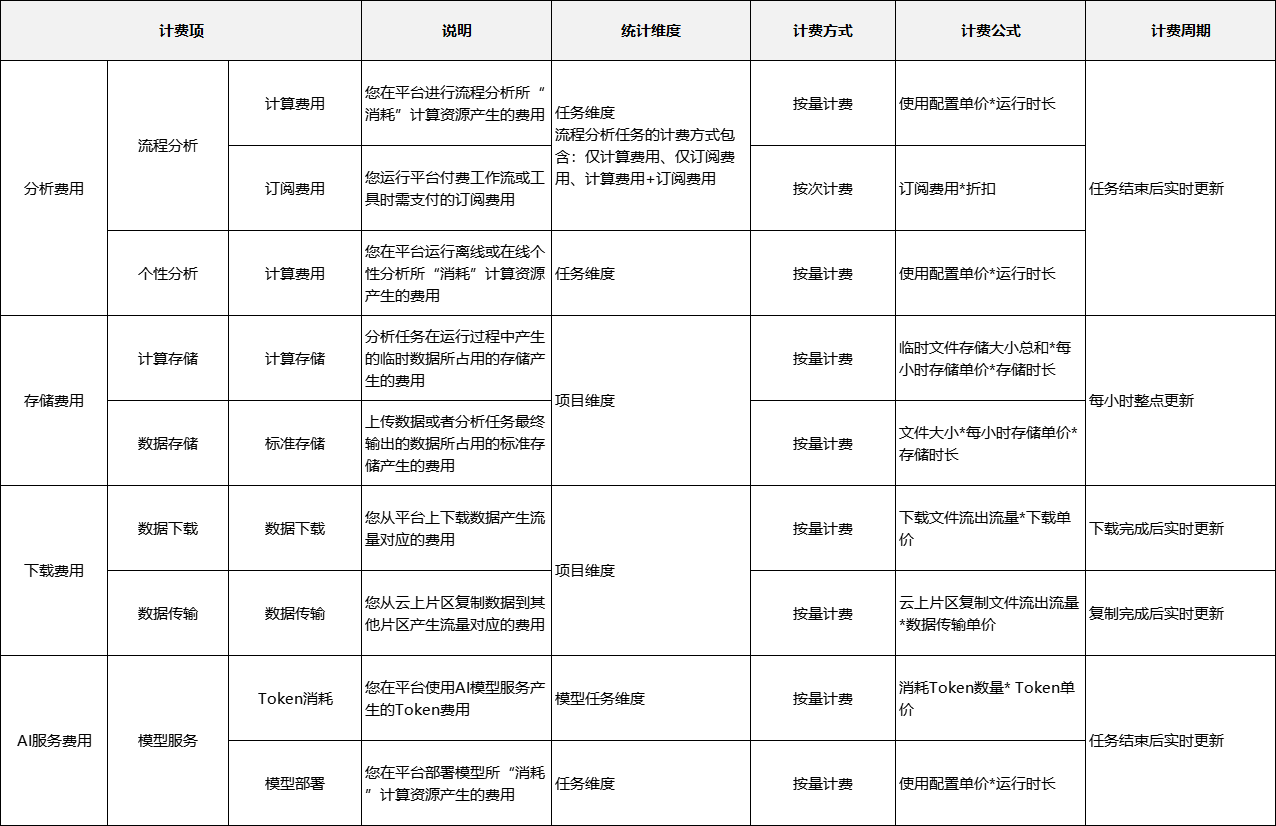 您在平台运行分析任务、存储数据、下载文件、订阅工具、从云上跨片区复制文件、使用Genos模型服务等,都将产生对应的费用,目前平台已有或在规划中的将产生费用的业务场景包括但不限于以下所列,供您参考:
