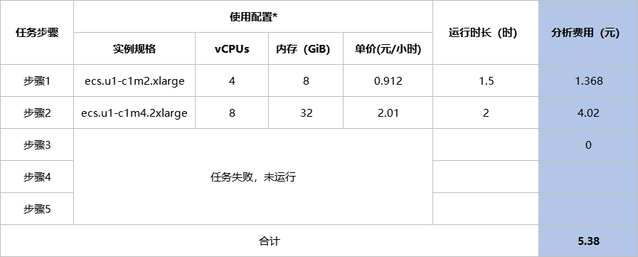 若上述示例中您投递的为非平台官方工作流任务,且在运行步骤3过程中任务失败,则仅计算步骤1、步骤2的分析费用为5.38元:
