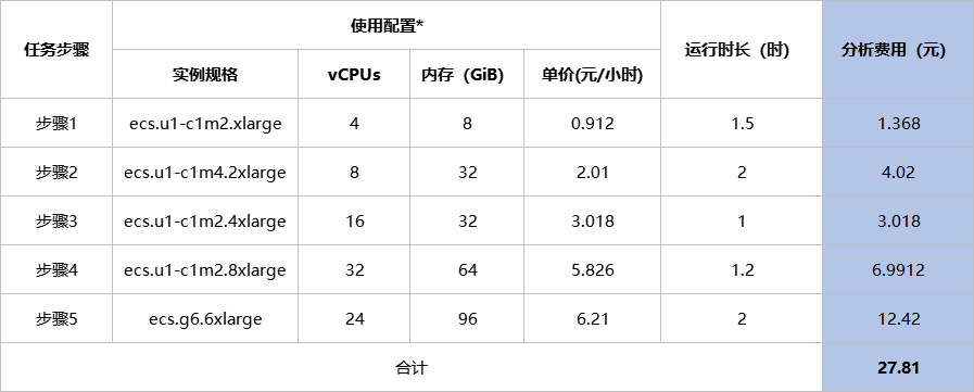 1)任务成功:假如您在平台投递了一个流程分析任务,该任务仅收取计算费用。任务包含5个步骤,下表假设了使用配置及运行时长,并据此计算出任务分析费用为27.81元。