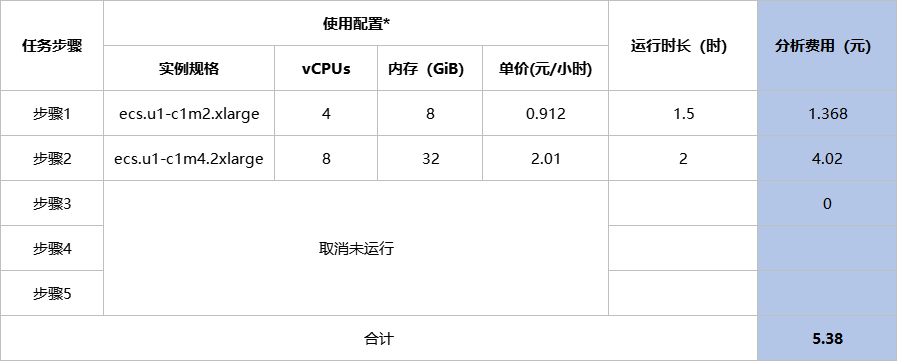 若上述示例中您在运行步骤3过程中取消了任务,则仅计算步骤1、步骤2的分析费用为5.38元。