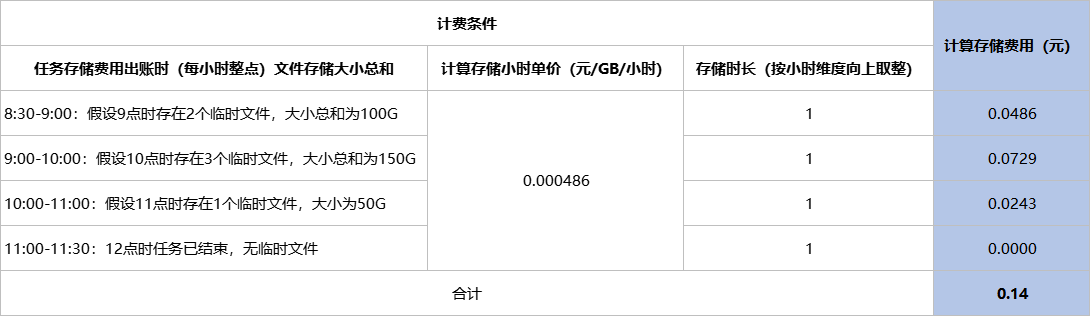 假如2024.3.1上午8:30您在平台项目B投递了一个分析任务,11:30任务结束,且期间该项目无其他分析任务。下表假设了计费条件,并据此计算出项目B此期间的计算存储费用为0.14元。