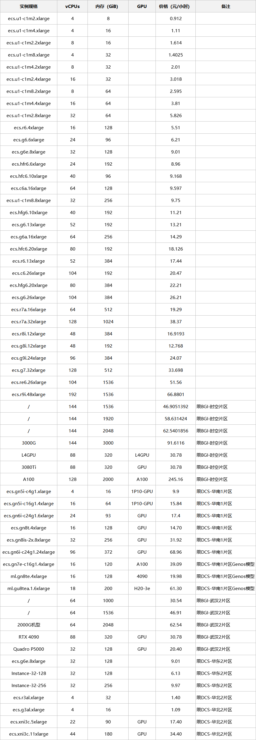 特别说明:除阿里云、华为云、火山云外的其他片区,若您申请的任务资源无匹配的机型,平台将按规格最接近的机型单价进行计费。如:您申请CPU:2,内存:4的资源,最接近的机型为ecs.u1-c1m2.xlarge(CPU:4,内存:8),则该任务将按0.912元/小时的单价进行计费。