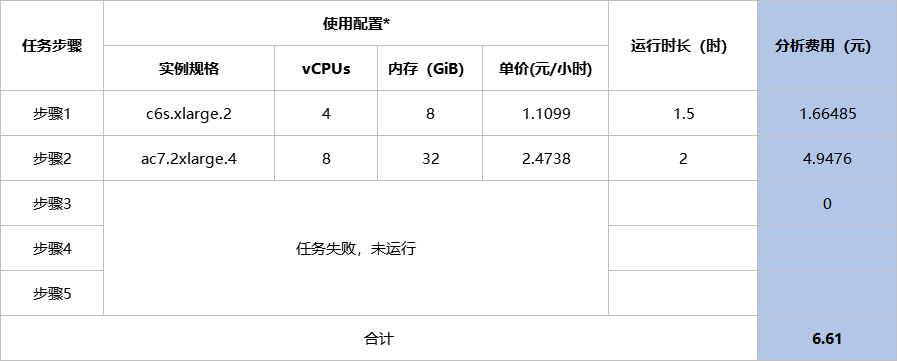 若上述示例中您投递的为非平台官方工作流任务,且在运行步骤3过程中任务失败,则仅计算步骤1、步骤2的分析费用为6.61元: