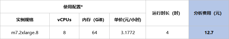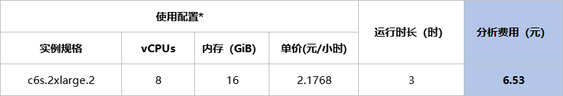 个性分析仅收取计算费用。假如您在平台投递了一个个性化分析任务,下表假设了使用配置及运行时长,并据此计算出任务分析费用为6.53元。