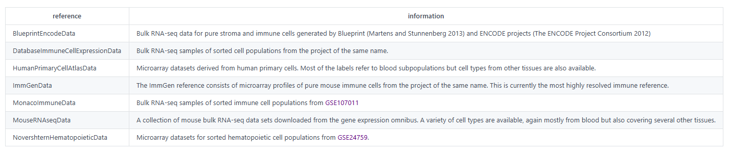 AnnotationRef:非必填。若选择进行细胞注释,则必须选择一个内置参考数据集进行细胞注释,可选参数为[BlueprintEncodeData, DatabaseImmuneCellExpressionData, HumanPrimaryCellAtlasData, ImmGenData, MonacoImmuneData, MouseRNAseqData, NovershternHematopoieticData] 。具体说明如下表: