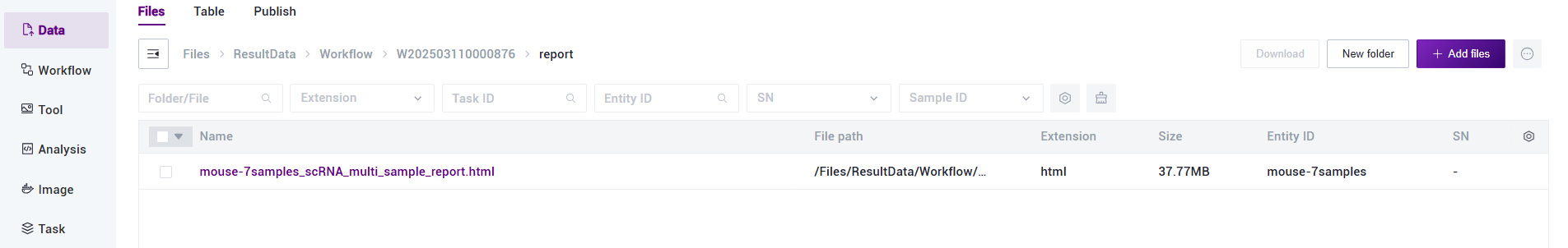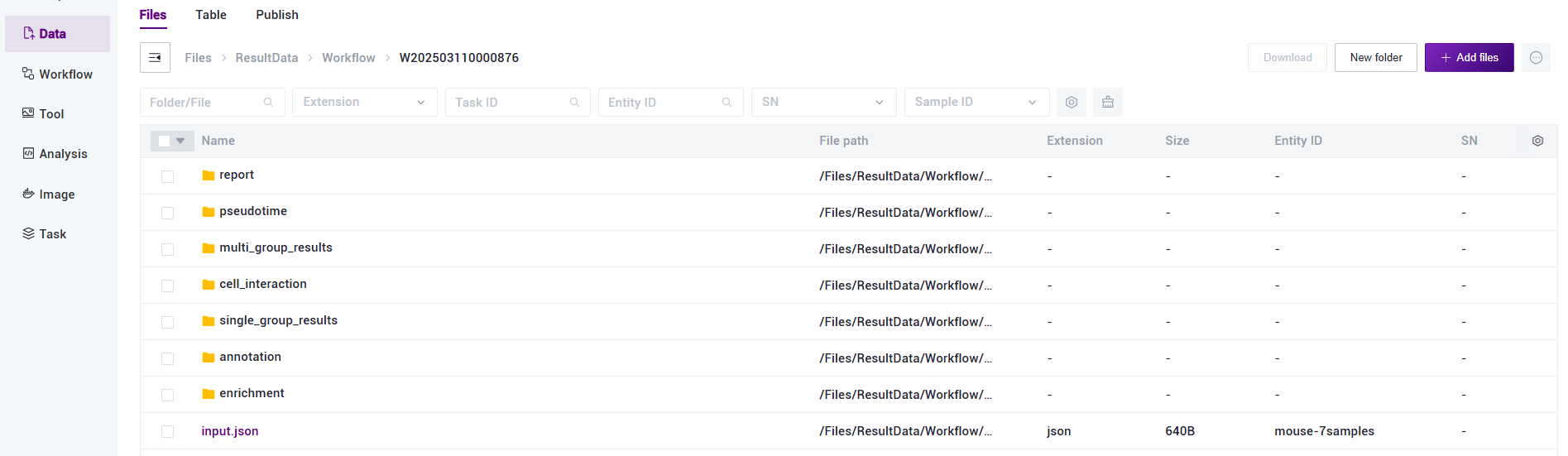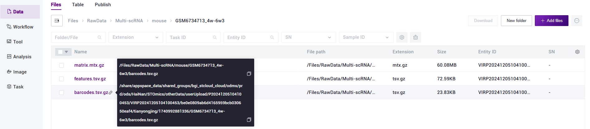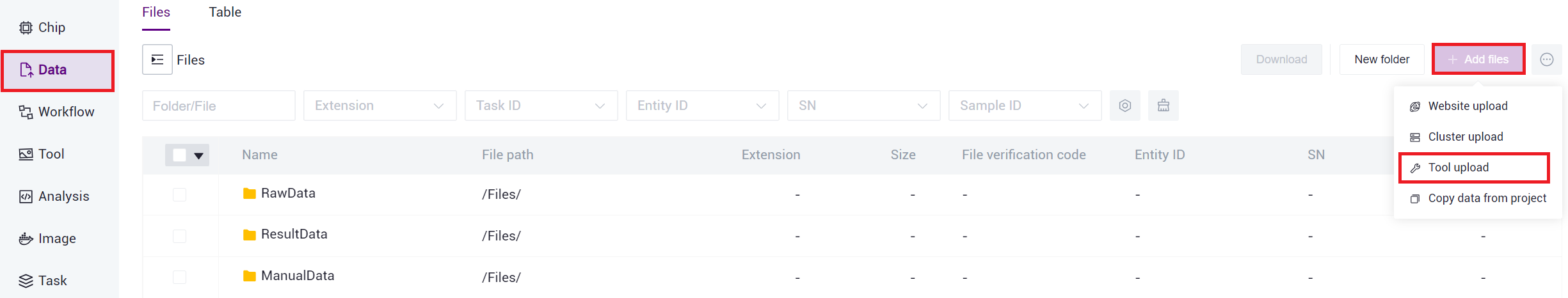 1)点击导航栏【Data】,进入数据管理页面,进入目标文件夹,点击右上角【+Add files】-【Tool upload】上传数据(图3-1):