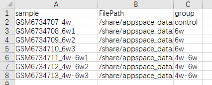sampleInfo:必填。包含样本名(sample)、矩阵文件夹(FilePath)和分组信息(group)的表格; 由用户在excel中填写,保存为csv格式,上传至数据管理。