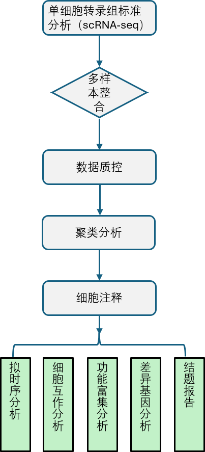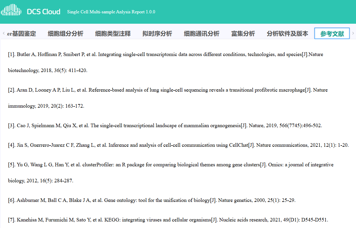 Single-cell-multi-sample-anlysis标准分析流程是基于DCS云平台系统开发的一款自动分析流程,其中包括质量控制、多样本整合、降维聚类、鉴定标志基因、细胞注释、拟时序分析、细胞通讯分析、功能富集以及报告生成: