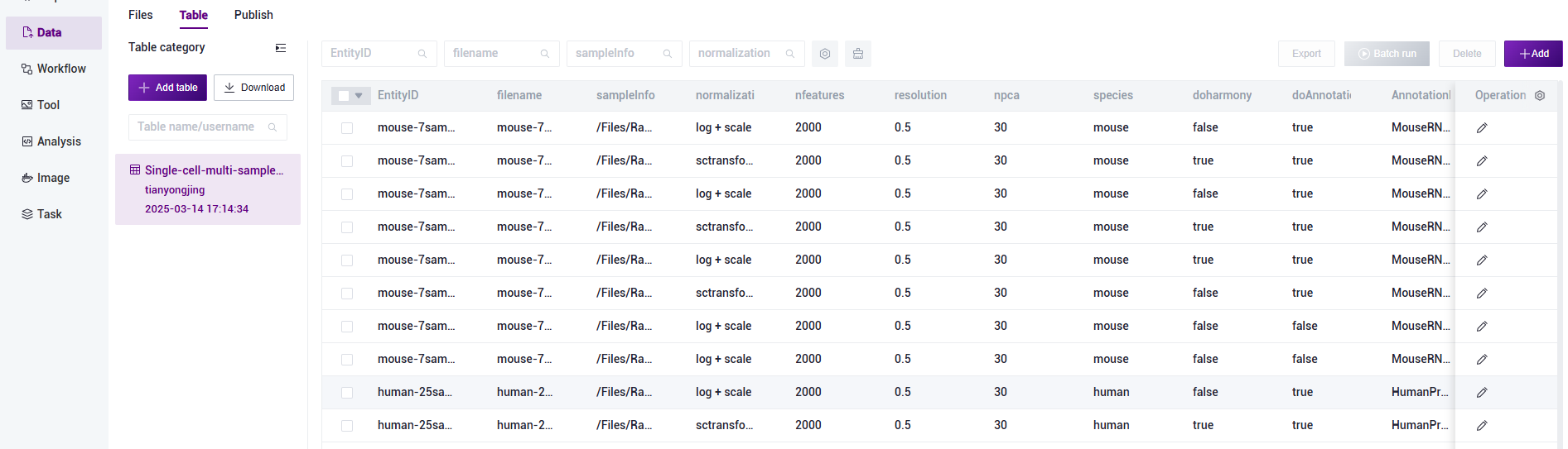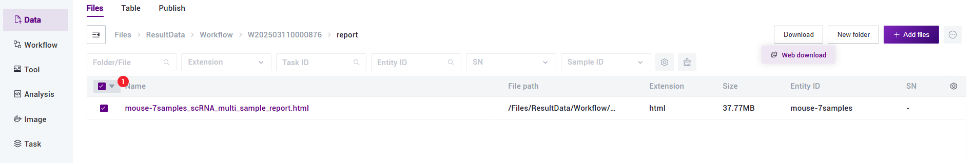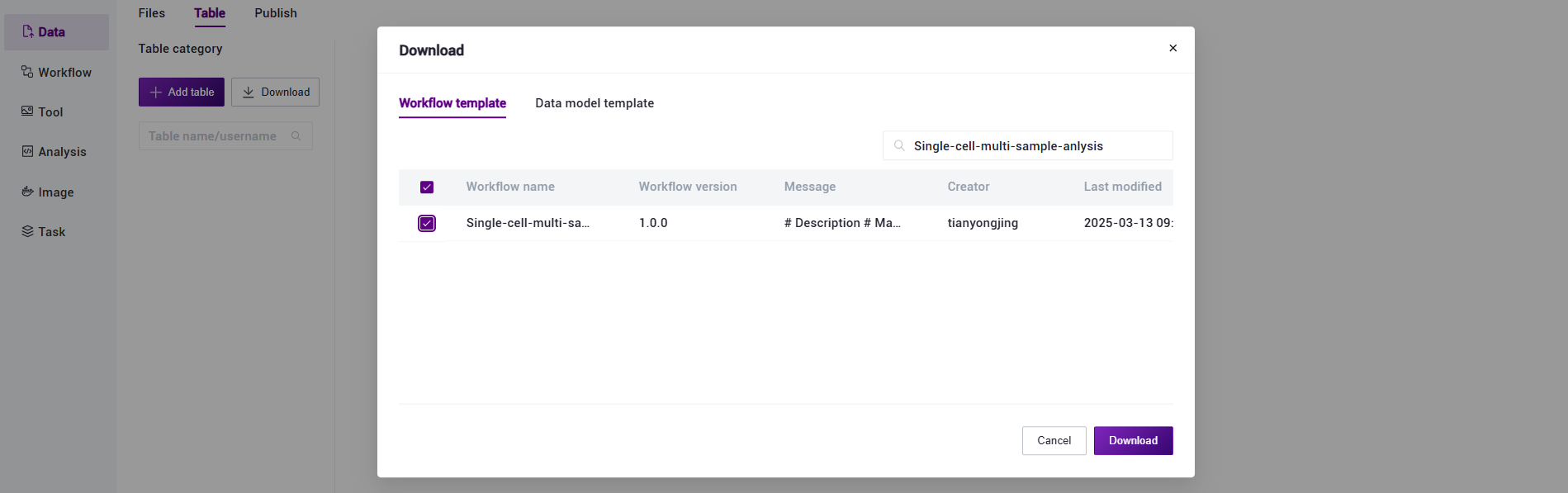 1) 点击导航栏【Data】,选择【Table】-【Download】(如图3-7), 点击【Workflow template】,选择 Single-cell-multi-sample-anlysis 模板下载: