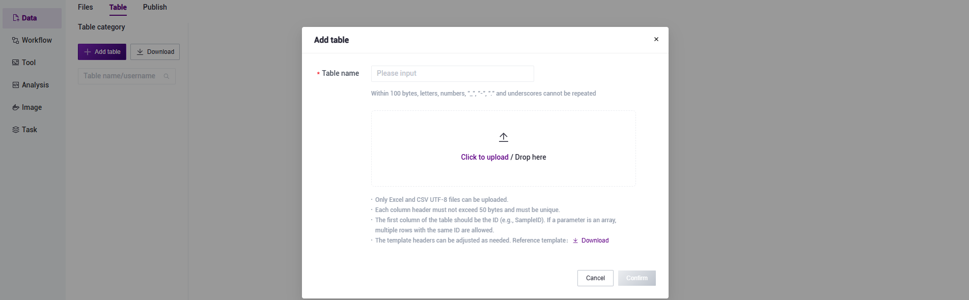 2) 配置好样本模板的分析样本录入工作表后,回到【Data】界面,点击【Table】-【+Add table】。点击【Click to upload/ Drop here】浏览并选择已填好样本信息的表格,点击【confirm】(图3-10):