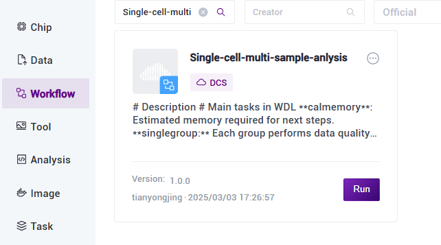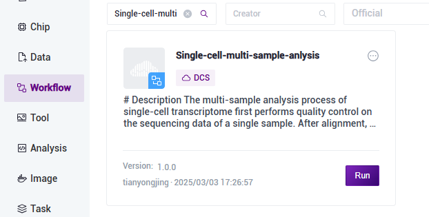 1)点击导航栏【Workflow】进入流程分析页面,在搜索框输入 Single-cell-multi-sample-anlysis,点击【Run】(图3-3):