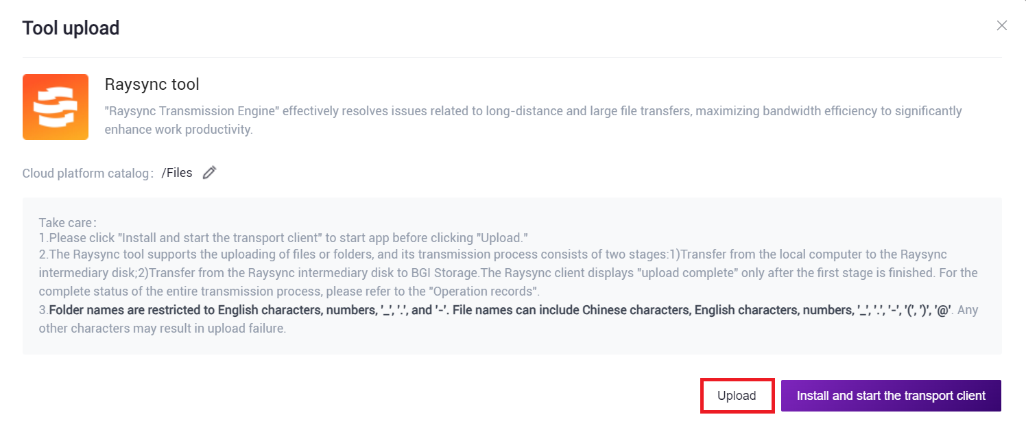 - 点击【Upload】浏览并选择所需文件(图3-2),上传完成后文件会在目标文件夹中显示(如首次上传,则需点击【Install and start transport client】安装所需工具):