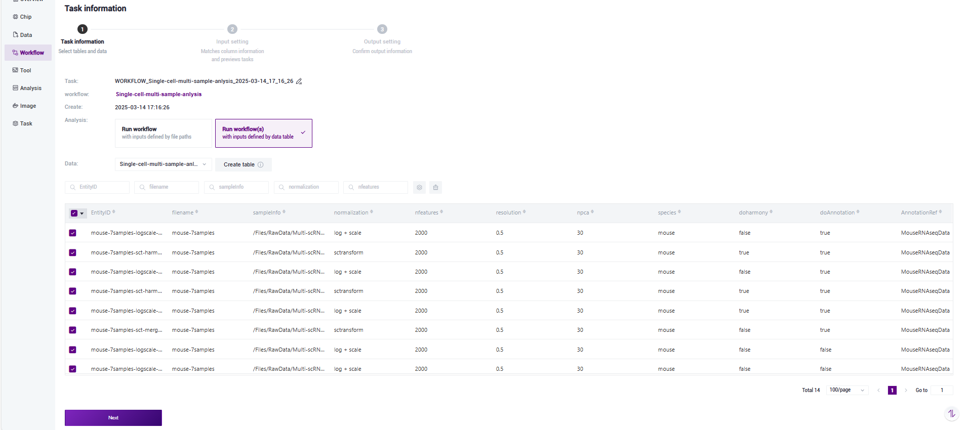 5) 选择Run workflow(s),点击 Please select table 处,选择在本小节3)中导入的表格,选中所需的行,点击【Next】(图3-13):
