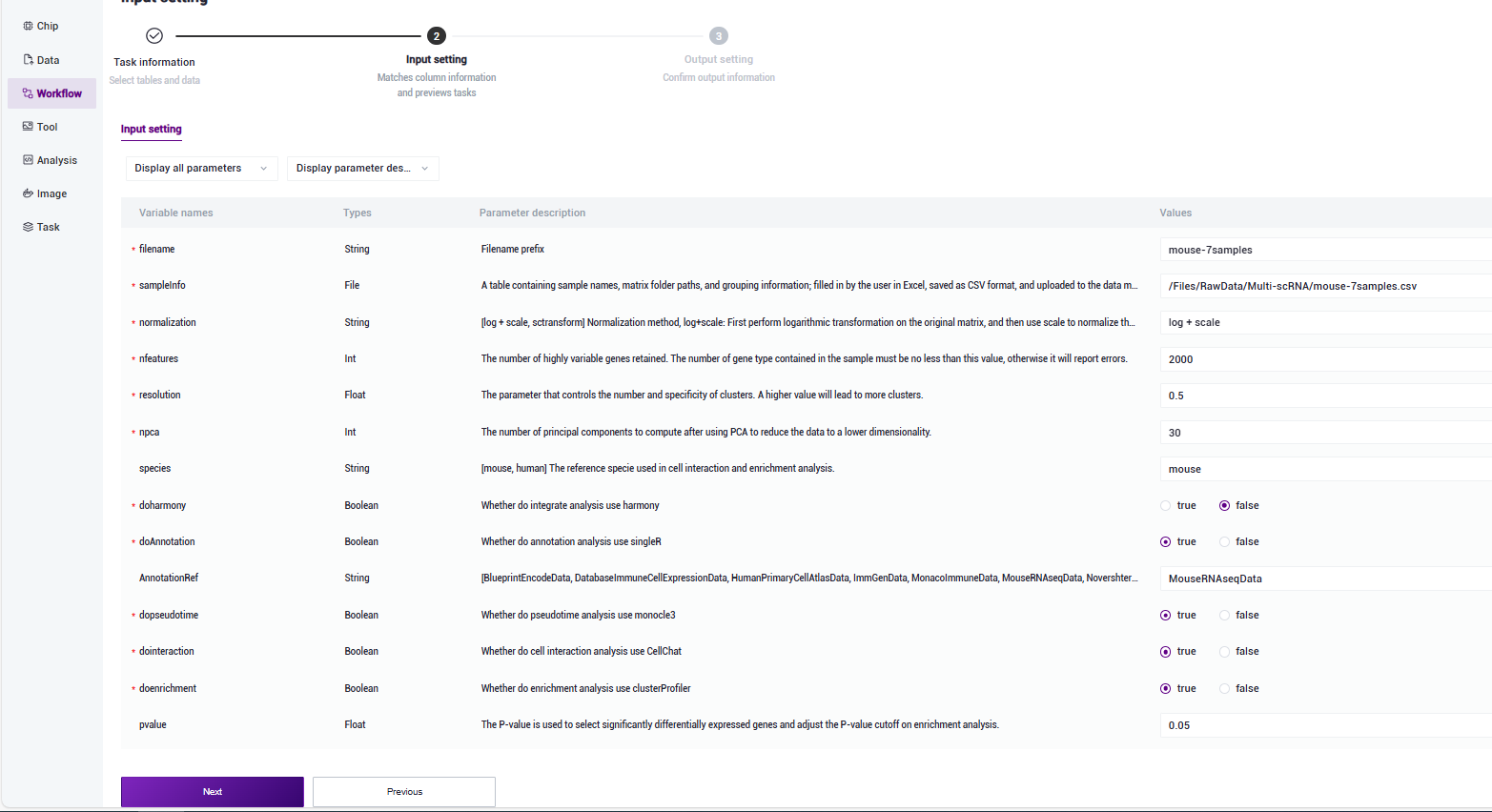 species:非必填。细胞通讯、富集分析所使用的参数物种,仅支持人或小鼠,只能填写human或者mouse,填写其他字符串均无法正常输出细胞通讯和富集分析的结果。