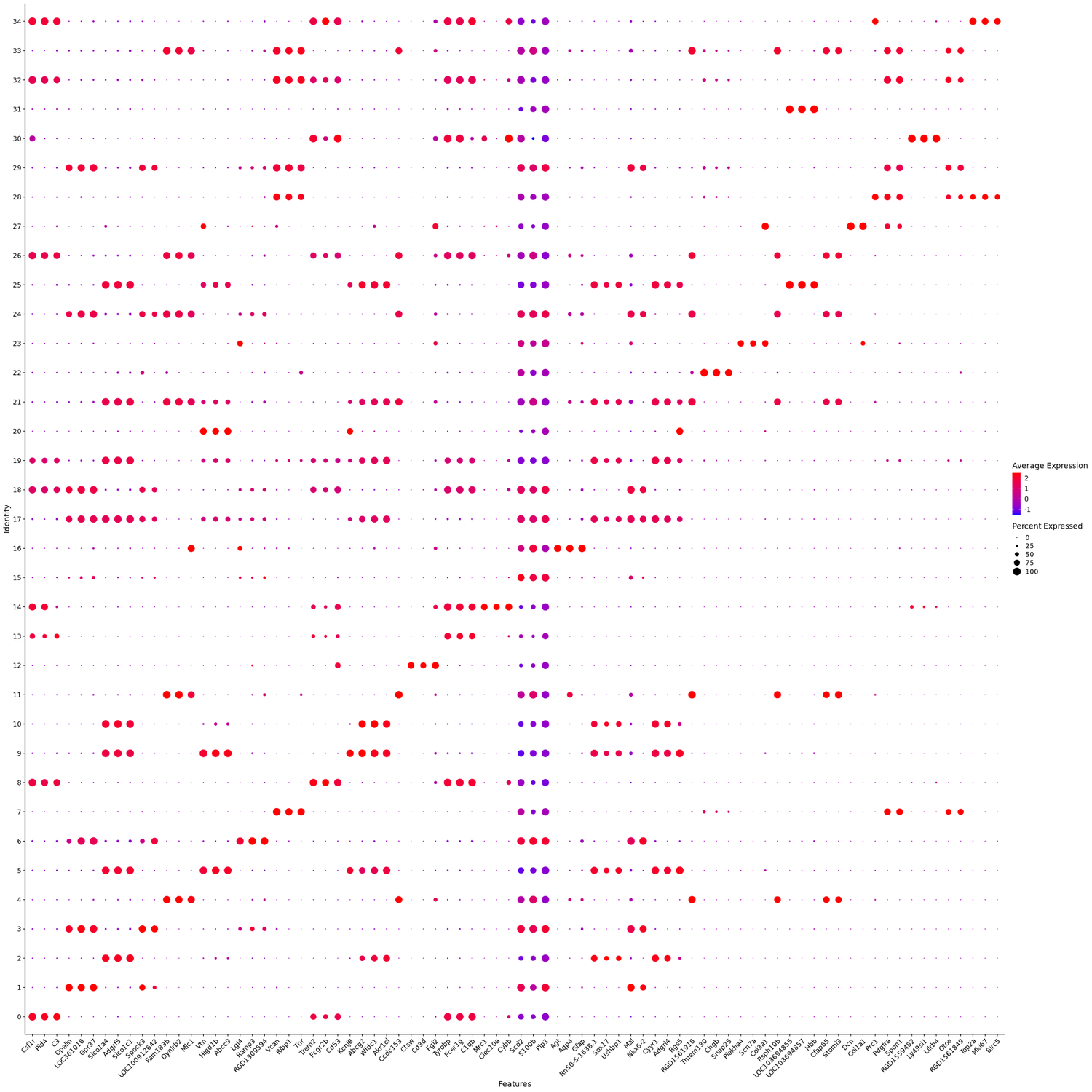 使用Seurat将整合后的聚类结果进行标志基因鉴定,生成标志基因表格、聚类热图、气泡图和点阵热图。若未选择进行细胞注释,则生成的标志基因表格csv将用于后续富集分析。