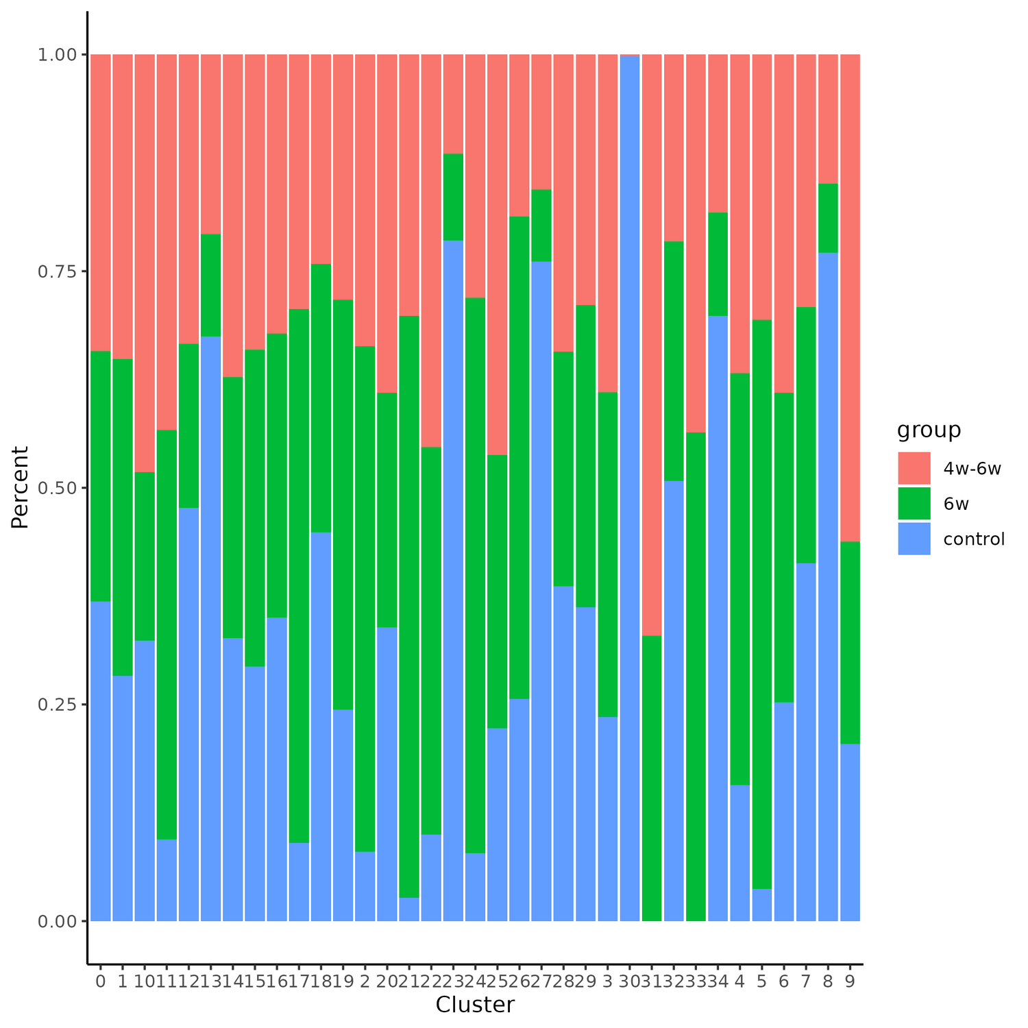 使用Seurat将所有矩阵文件合并或者去批次整合为一个基因表达矩阵,进行聚类并统计了每个分组中各个分群的细胞数的比例以及每个分群中各个分组细胞数的比例。该步骤将输出以Seurat格式储存的rds文件,若未选择进行细胞注释,则该整合后的rds结果用于后续拟时序、细胞通讯分析。