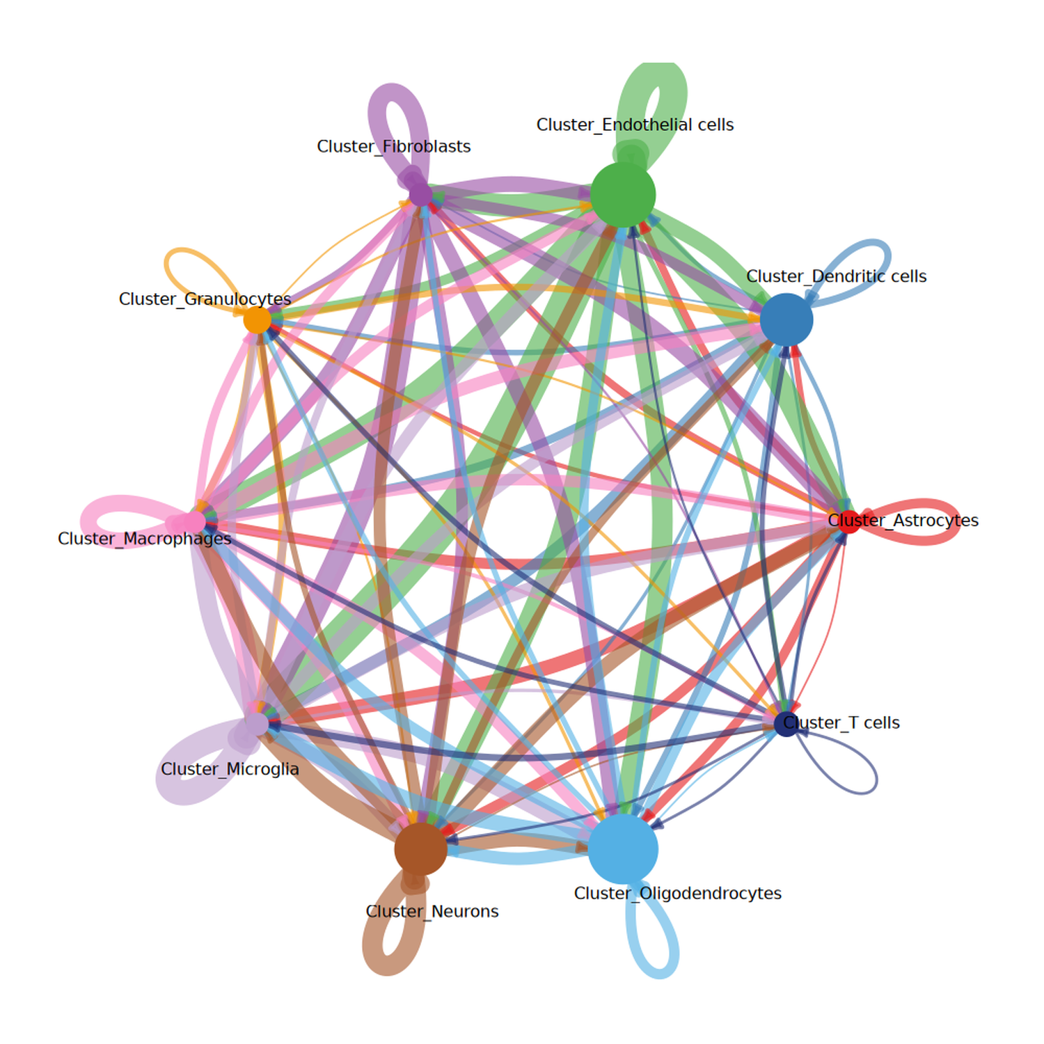 使用CellChat进行细胞通讯分析,基于其内置的高质量信号分子互作数据库,对细胞进行差异表达分析和统计测试,推断不同细胞之间特定的通讯信号并可视化。该步骤输出细胞通讯网络图和以CellChat格式储存的rds文件。