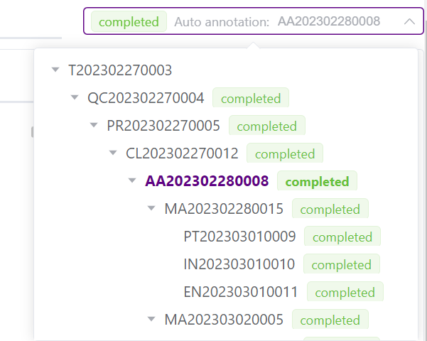 任务列表中可查看同一文件所投递过的全部历史任务,以树形结构展示,支持展开/收起,以便区分任务之间的关联性。且各任务均标明任务状态,包含“complete”、“failed”、“running”、“deleted”等。