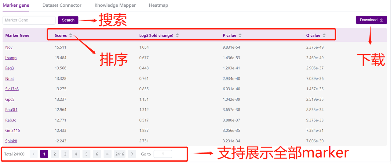 Marker gene列表中包含全部结果,不再仅限于Top 10。