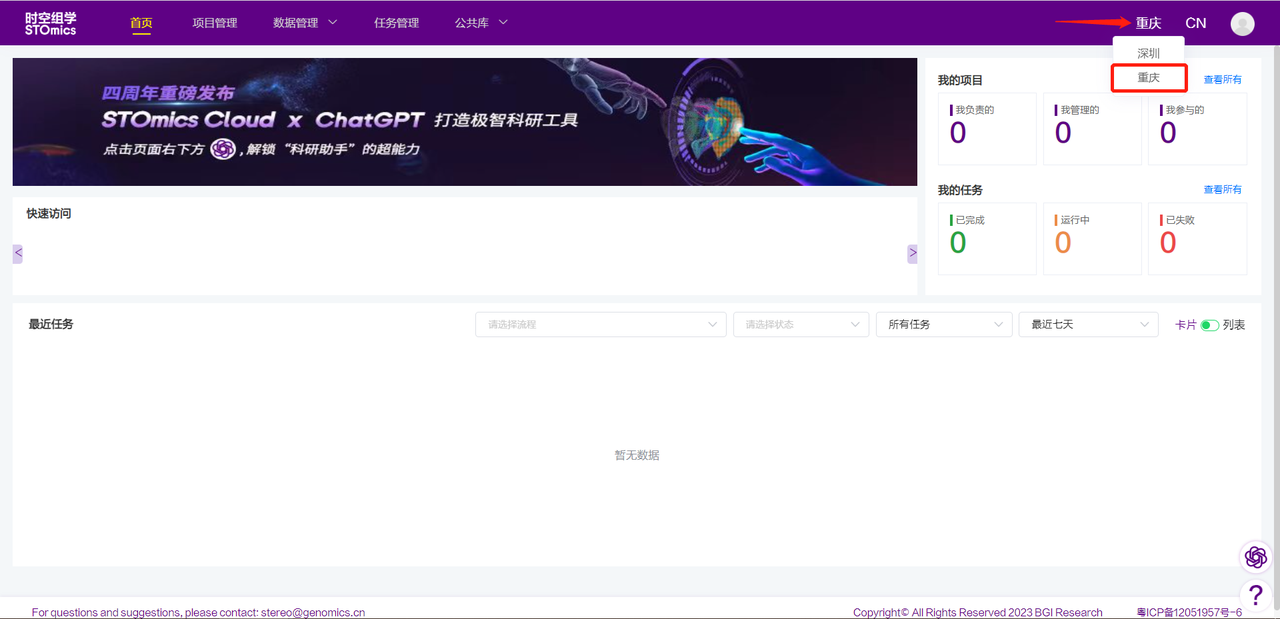 新增重庆数据片区,可登陆:https://cloud.stomics.tech,并将右上角区域切换至“重庆”