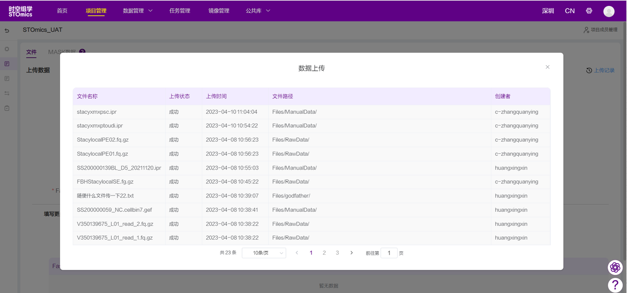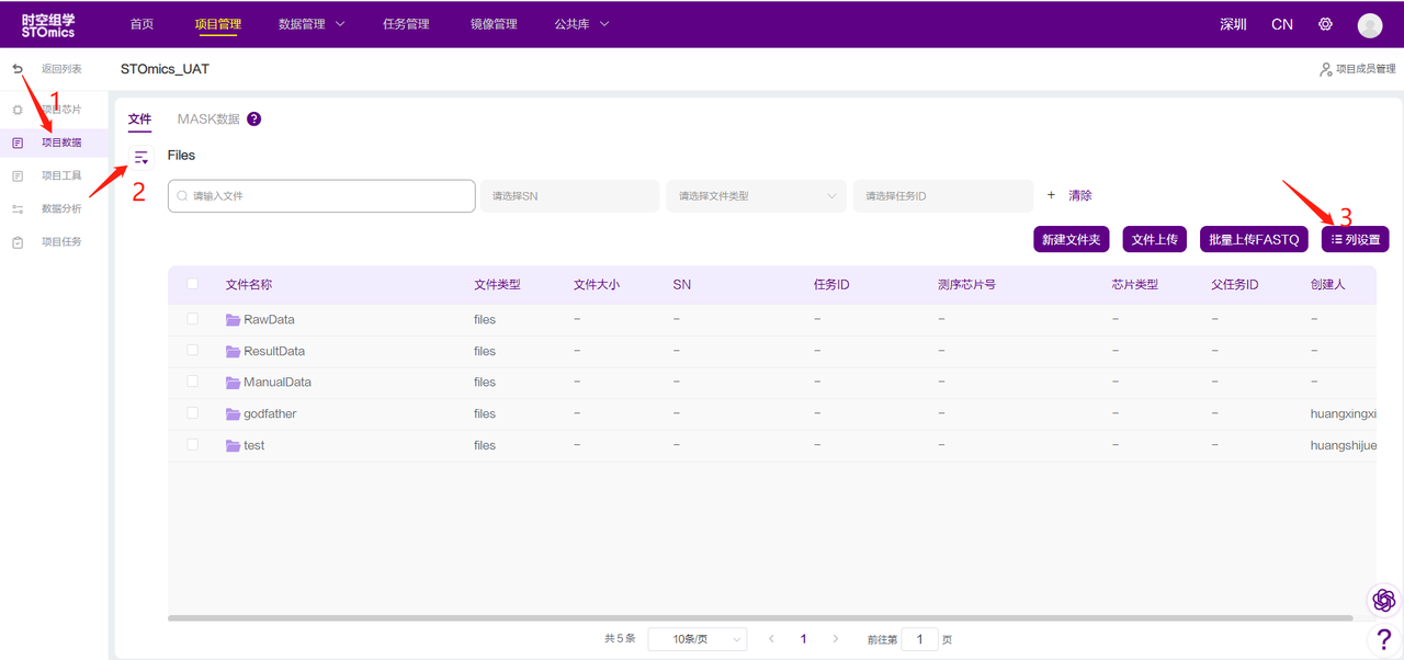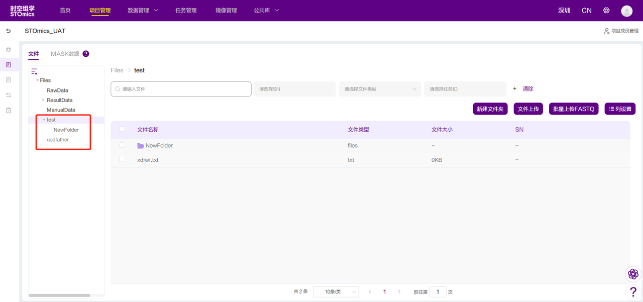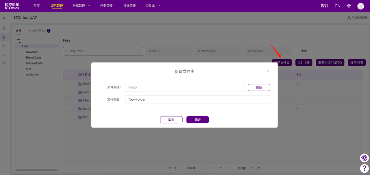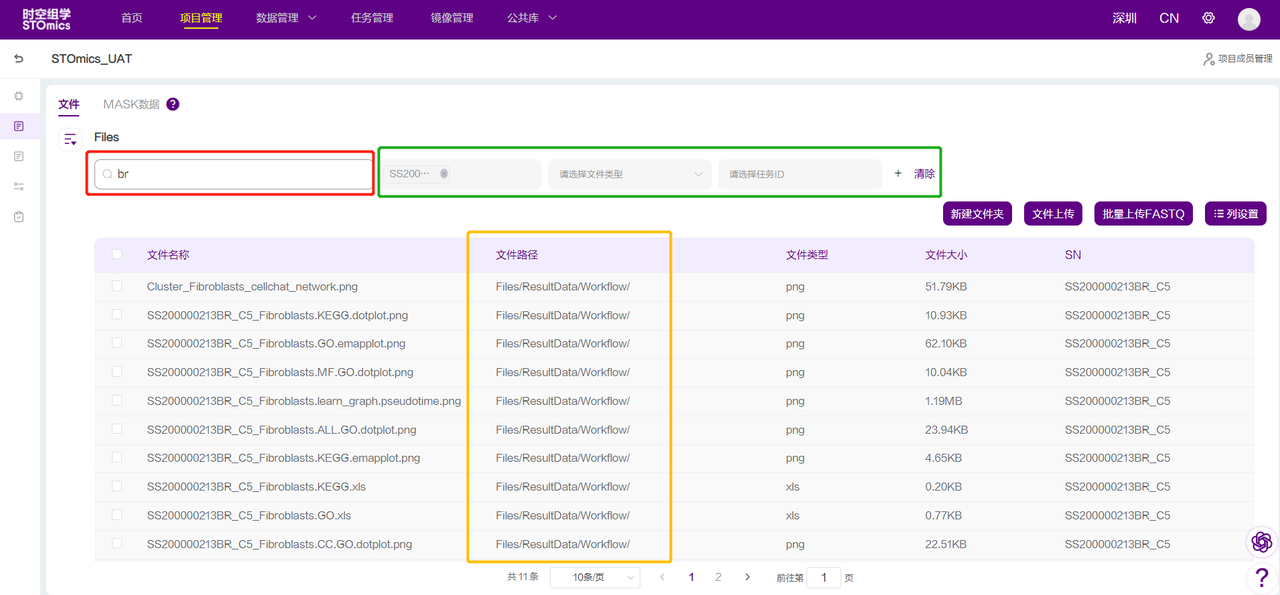 在Files、RawData、ManualData和新建文件夹里均可以看到文件上传的按钮,点击【文件上传】按钮即上传数据;支持上传FASTQ(本地和集群上传)、ipr、gef和其它文件,本地上传FASTQ、gef和其它文件时会调用镭速工具上传。