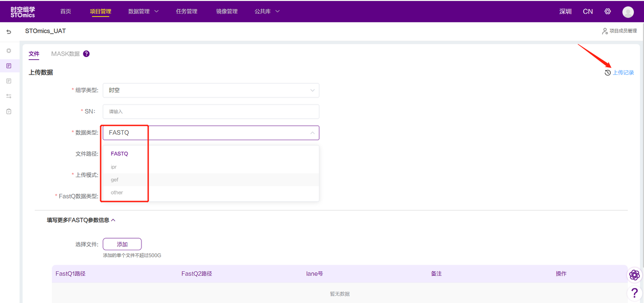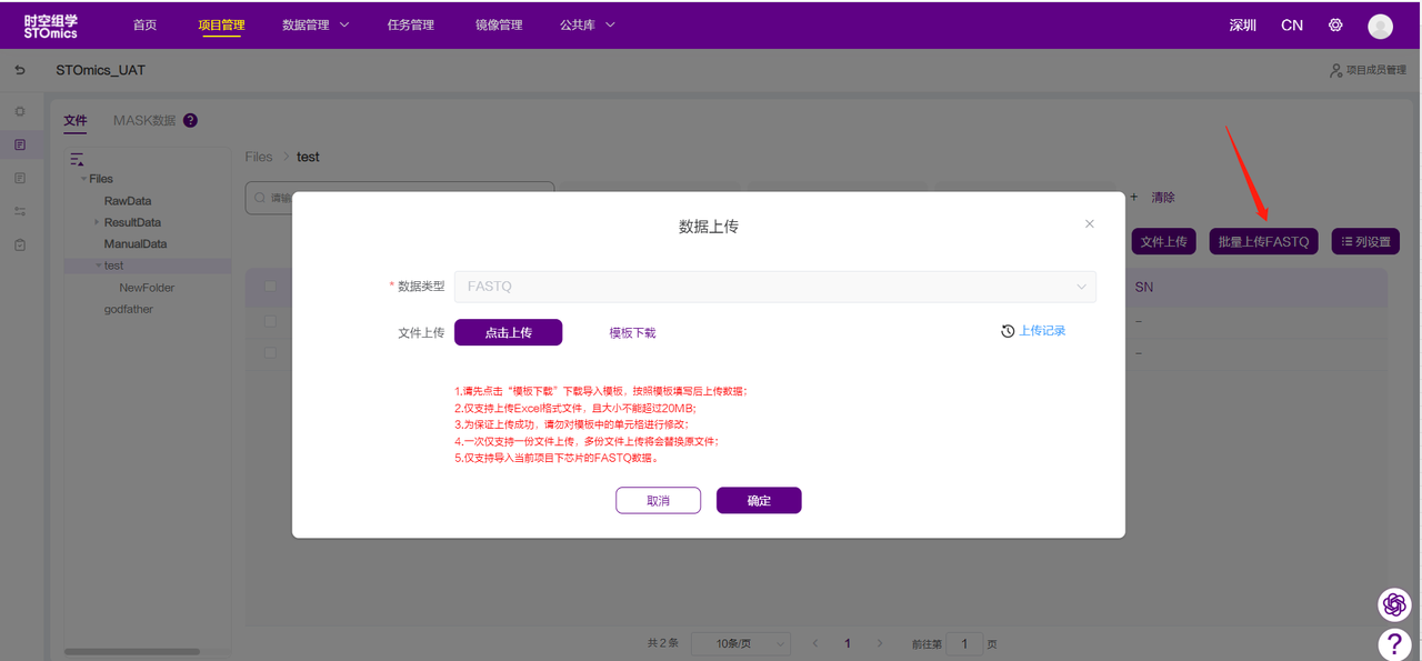 点击【批量上传FASTQ】即可以excel模板方式批量上传FASTQ数据;
