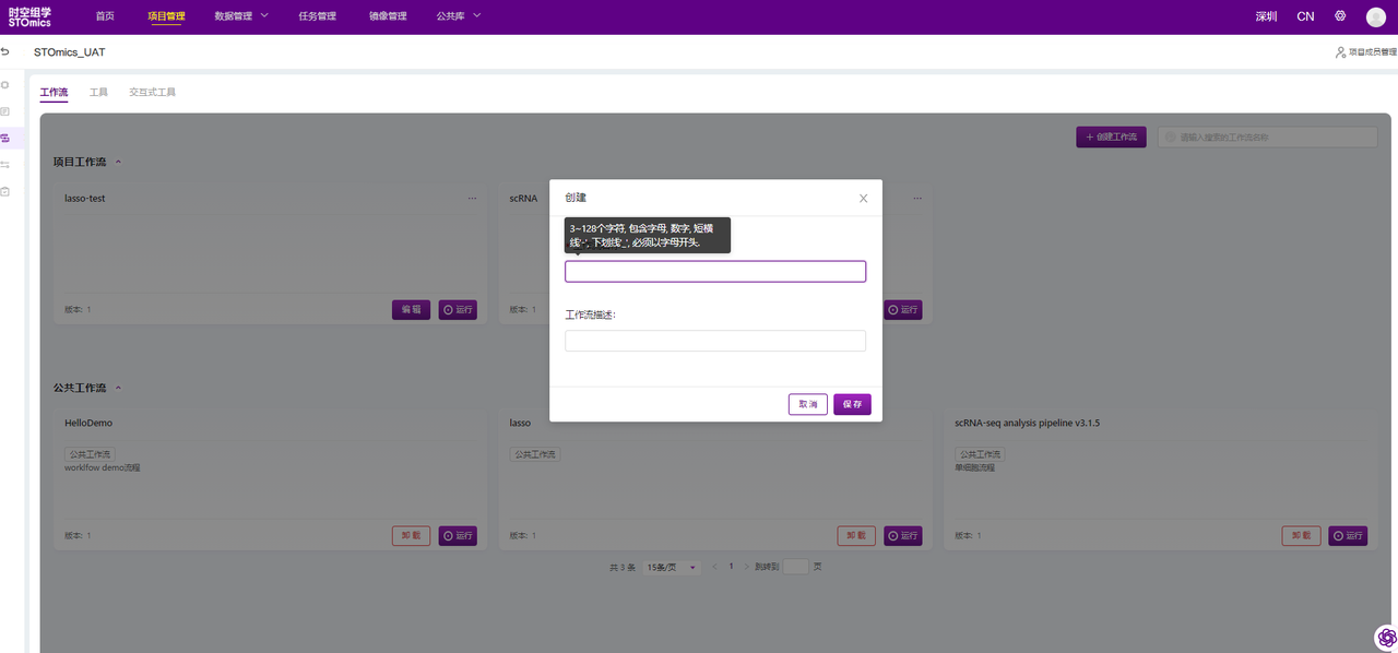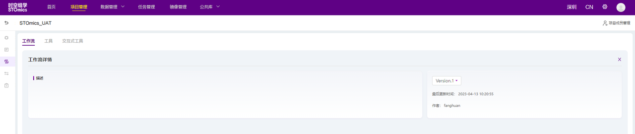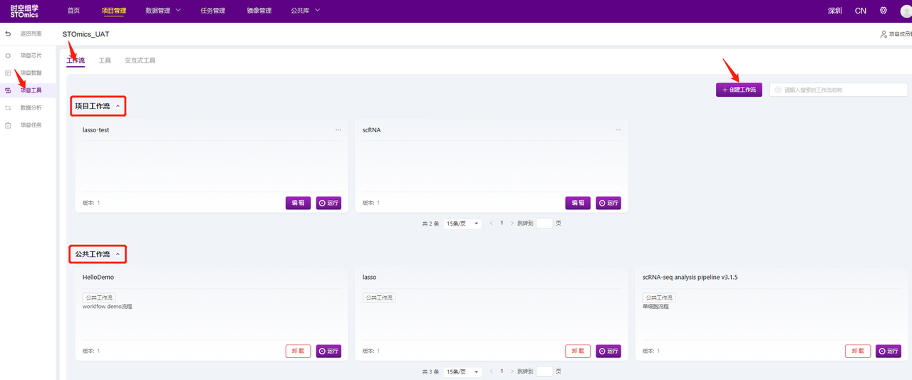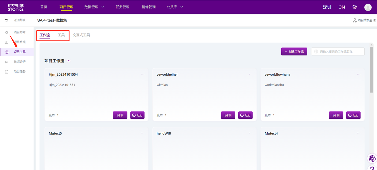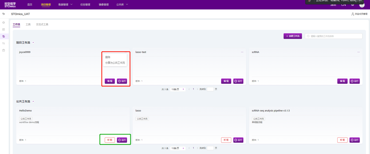 1)项目工作流可以编辑(当前版本)、运行(当前版本)、删除(当前版本)和分享为公共工作流(所有版本);