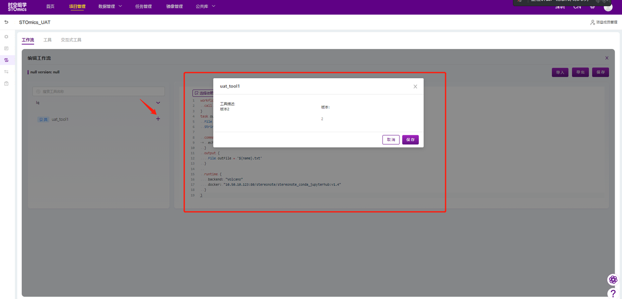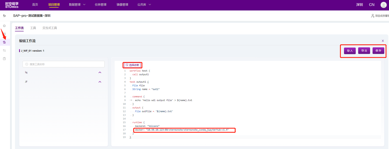 第二步:编辑工作流wdl,可以使用工具(包括流程分析和安装进项目的公共工具)的wdl,也可以直接导入wdl文件来新建;上传wdl所需的依赖文件,支持依赖文件下载和wdl导出的功能;