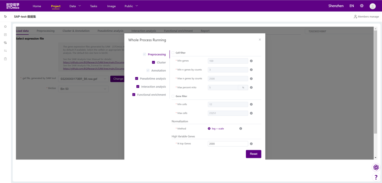 支持单张芯片一次性投递全部分析流程(包括:预处理、分群、注释、拟时序、细胞互作、功能富集),分析流程可选(必须包含预处理和自动注释两个步骤),各流程参数支持自定义。