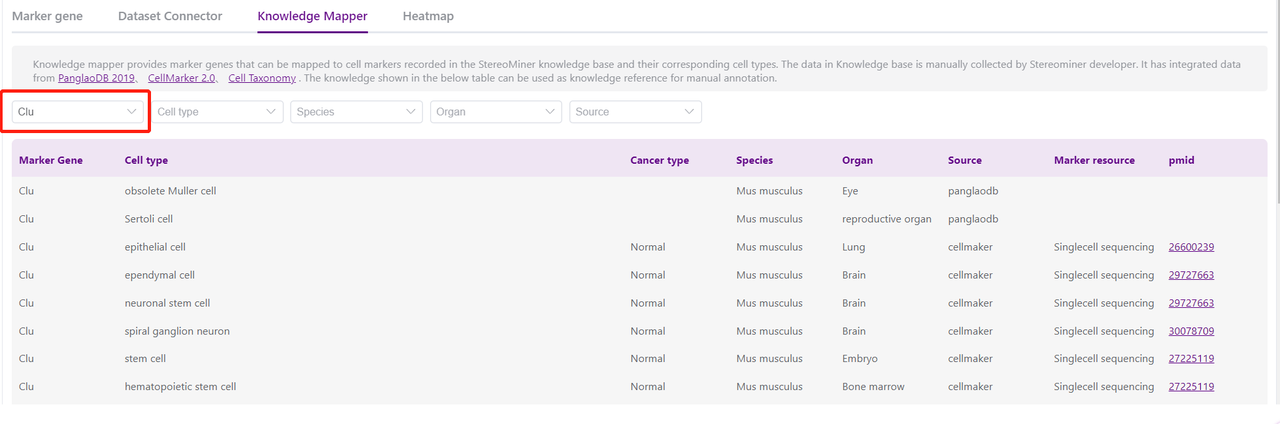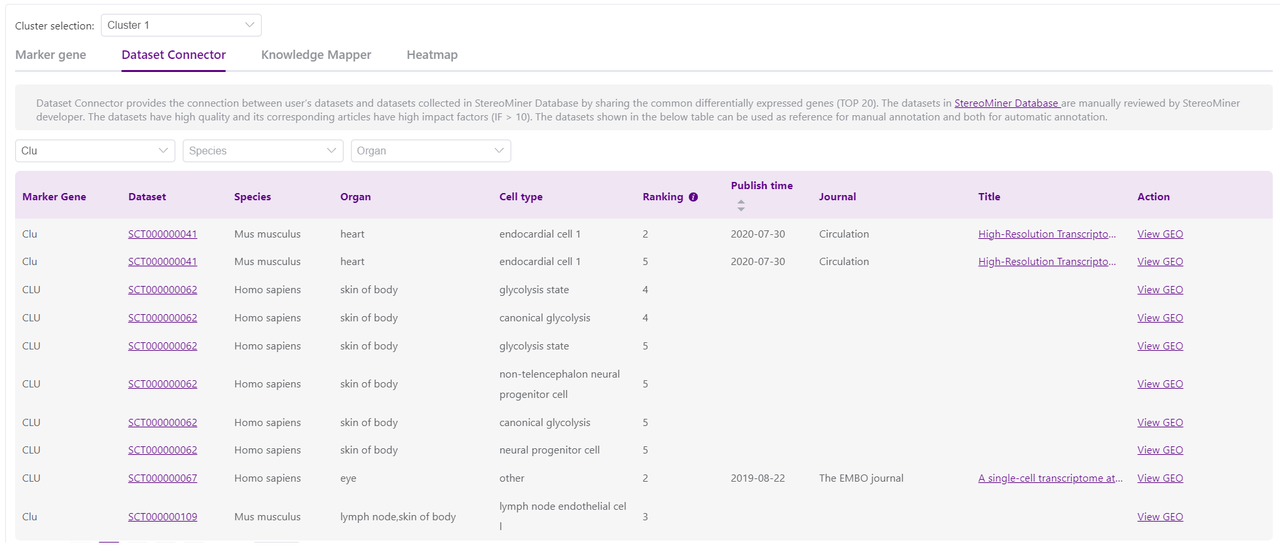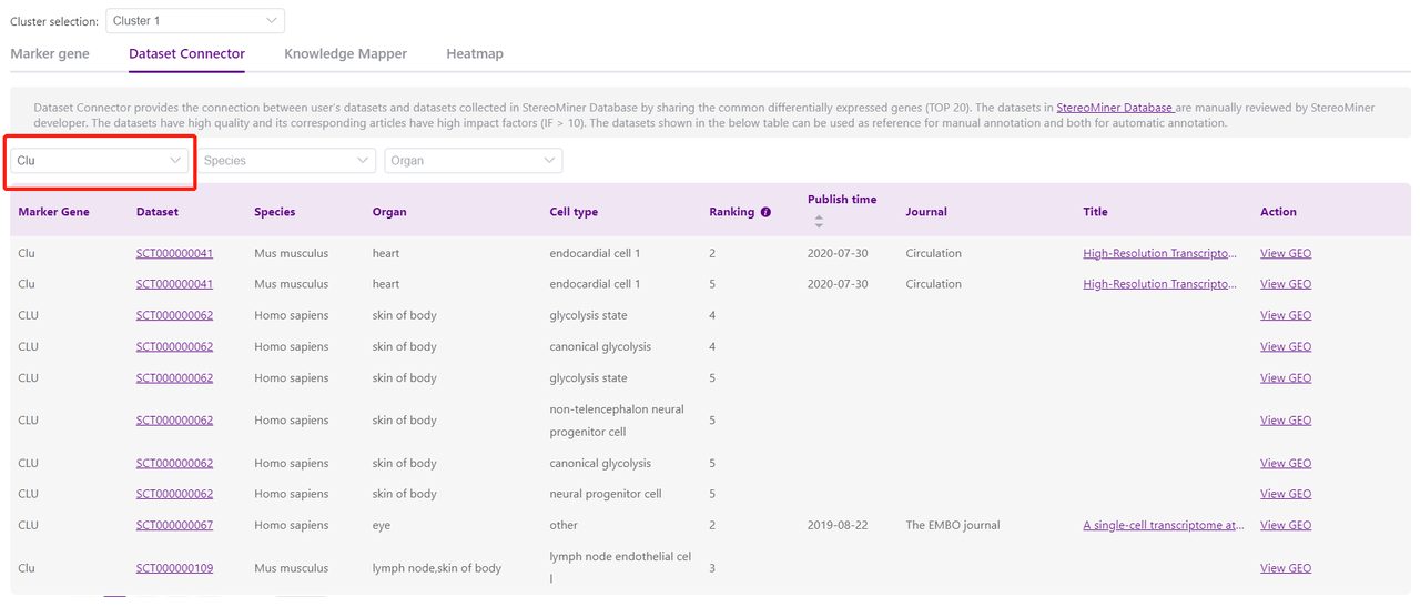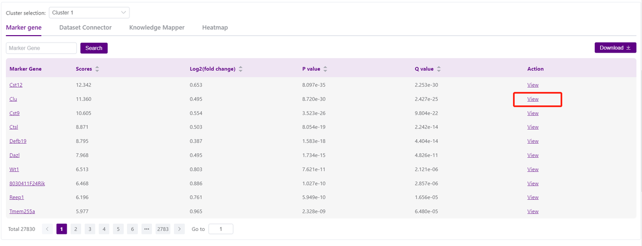每个marker gene后增加“View”操作,点击即可跳转至Dataset Connector中,查看该基因的相关信息。