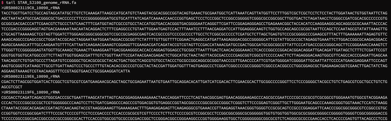 - 在参考基因组的FASTA文件中手动添加rRNA序列,在染色体序号列上增加 '_rRNA' 的后缀标识,用于程序识别,与原始参考基因信息区分开来,示例如下: