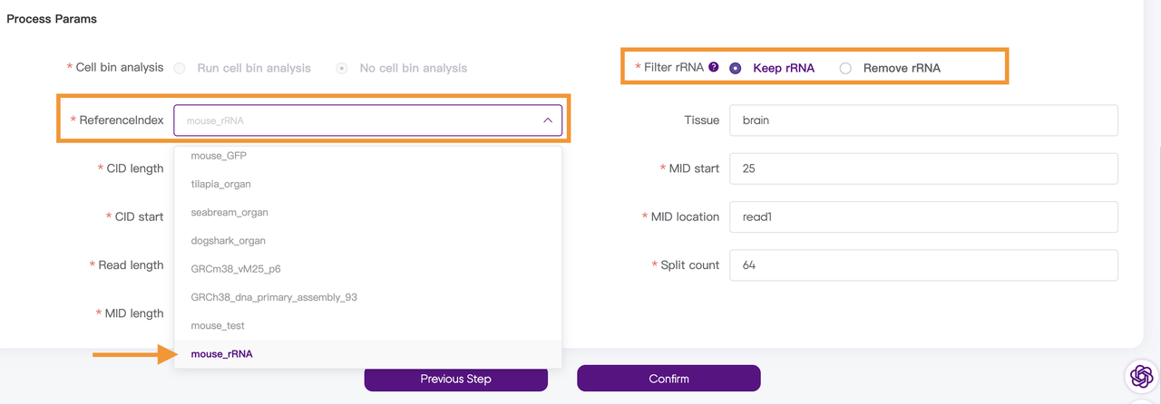 - 如果需要进行rRNA过滤,需要选择含有rRNA序列且构建了索引的Reference,选择“Remove rRNA”后才会生效。