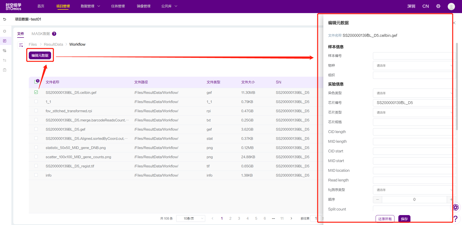 成功添加文件后,在数据管理页面,选中一个文件,点击按钮【元数据编辑】,页面后边会弹出编辑元数据对话框。填写元数据信息后,点击按钮【保存】即可。