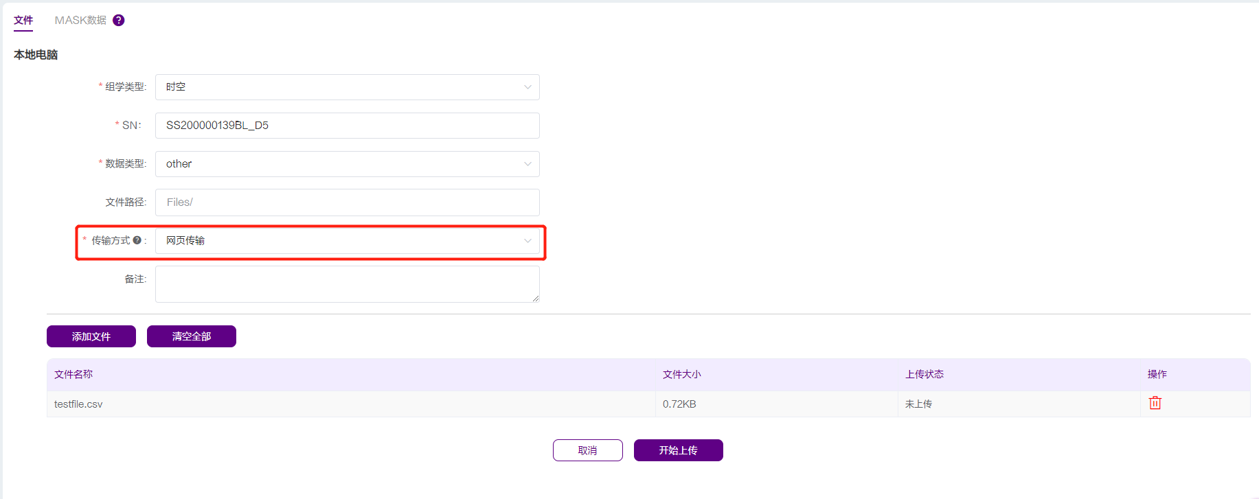 在本地电脑界面,组学类型为时空,数据类型为other,传输方式选择“网页传输”。
