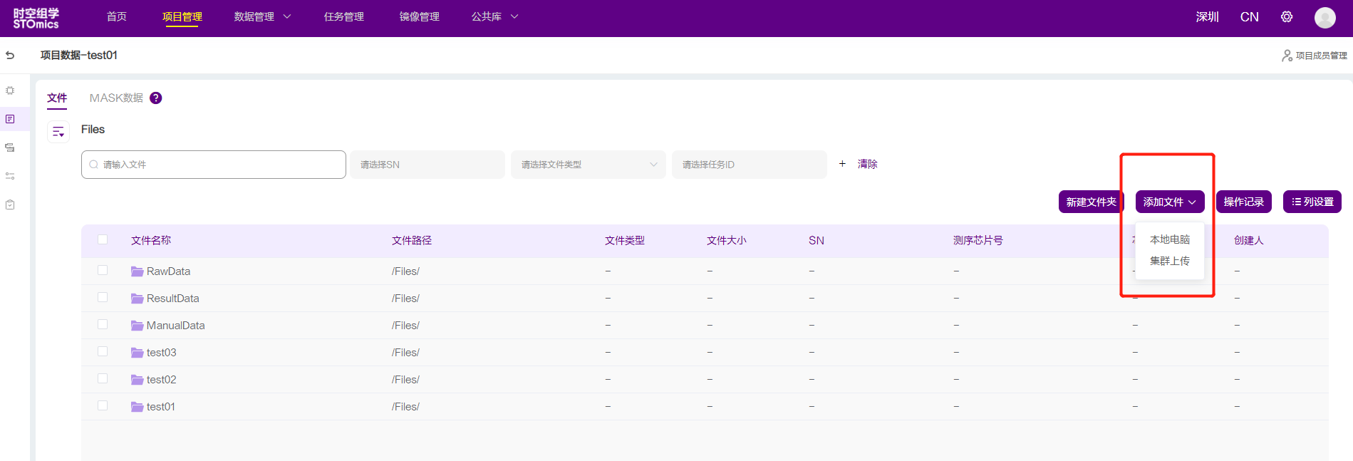 数据管理页面,添加文件由原来的两个入口(文件上传、批量上传FASTQ)统一为一个入口(添加文件),点击按钮【添加文件】后,可选择数据来源【本地电脑】、【集群上传】。