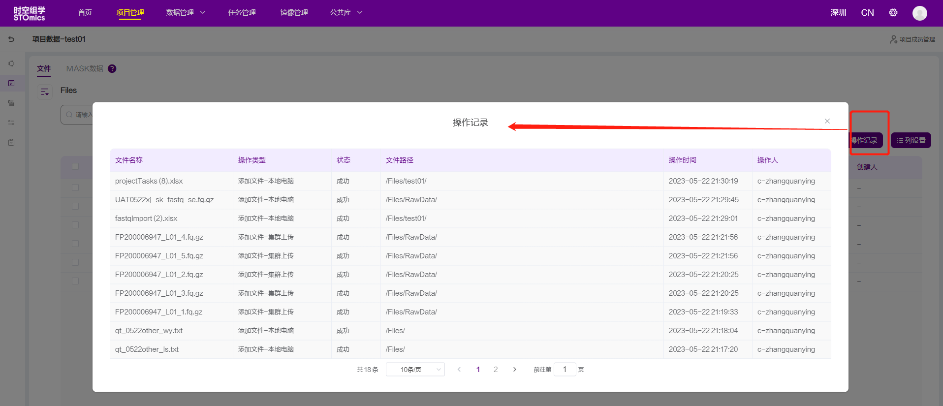 用户在数据管理页面,点击按钮【操作记录】,即进入操作记录页面,该页面展示了所有添加文件的记录。未来还会继续扩展其他对文件操作的记录。